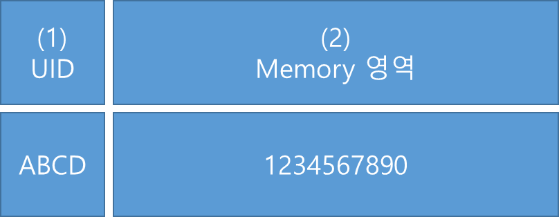 RFID 의 구조는 하나의 큰 메모리 변수와, 그에 상응하는 UID 코드로 구성되어 있다.
