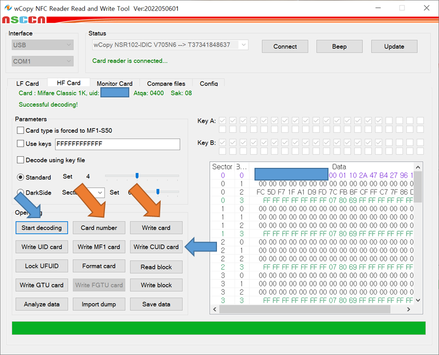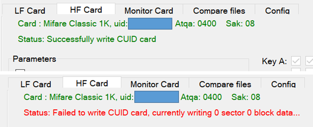 - Write UID Card / Write MF1 Card 버튼은 위에 명시한대로 UID 카드의 메모리 영역을 저장하는 기능 같고, MF1 버튼은 MIFARE classic 1k 타입으로 저장하는 기능 같다. (이부분은 정확하지 않음)